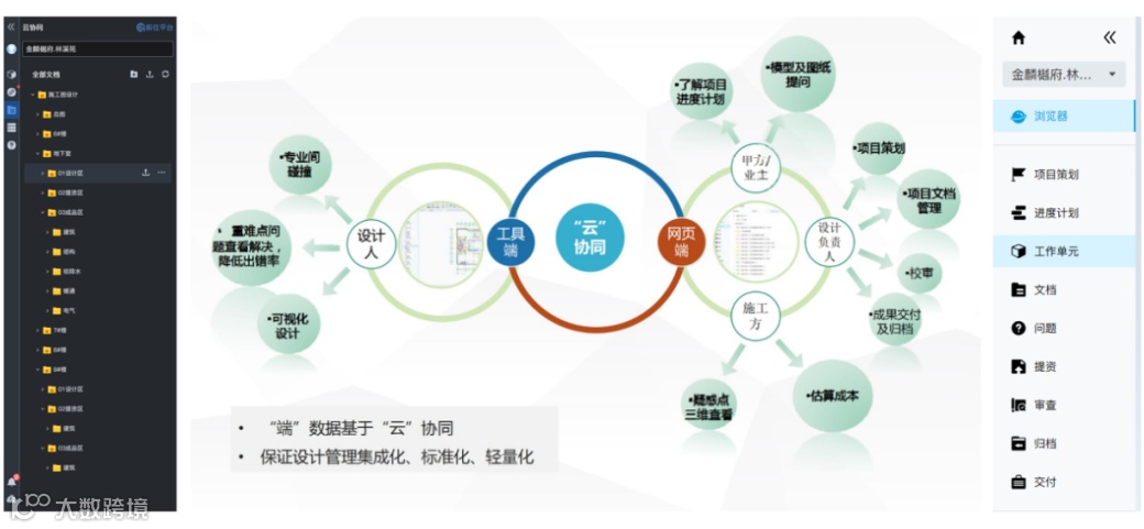 借助“云+端”设计管理体系,内置BIM协同体系、问题追踪体系、图模一致性检查、项目看板(工时、构件分布查询)、成果交付及归档等功能模块,实现业主、设计、施工多方联动,以及设计管理可视化,使过程数据可追溯,资源可复用。