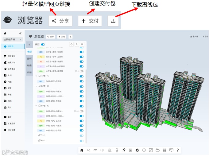 项目通过网页端创建交付包,打包提交设计成果,内容包括模型及二维图纸,并通过邮件将交付包下载地址发送给业主,实现与业主方,施工方等多方联动。