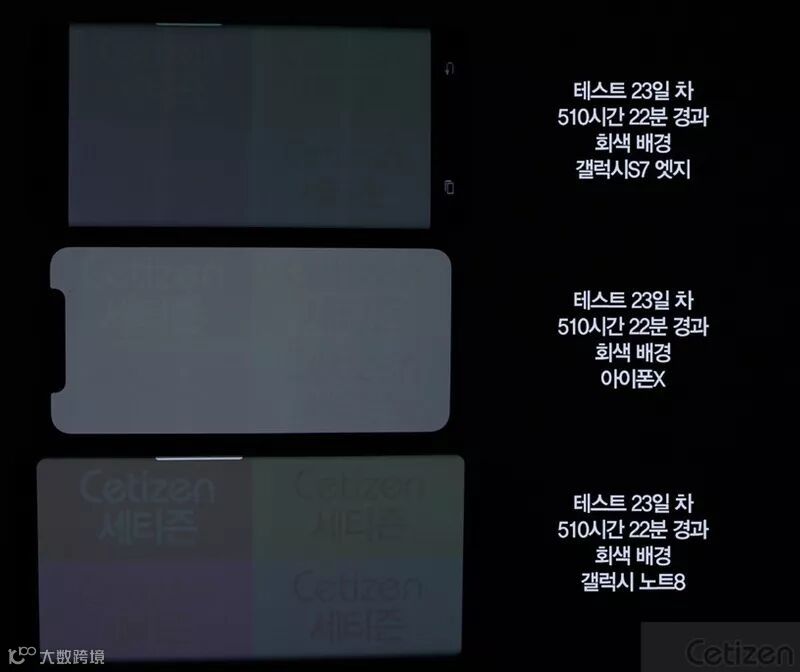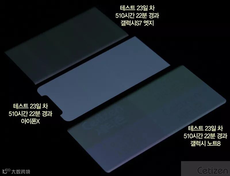 Cetizen 为我们带来了 iPhone X、三星Note 8和三星 S7 Edge 的烧屏测试对比。