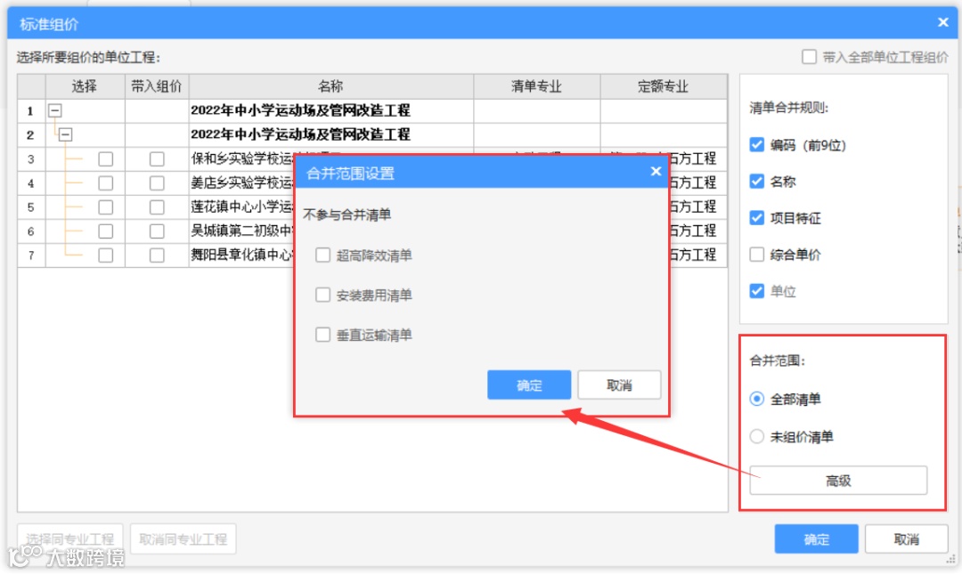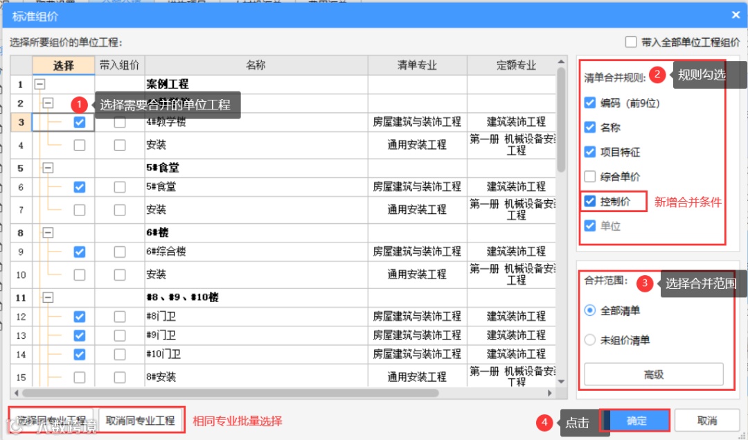 增加合并范围,支持未组价清单/全部清单作为合并范围;支持特殊清单不做为不参与合并清单的选择。