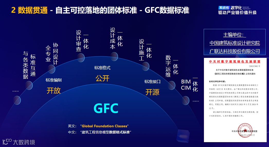 数据贯通——通过统一语义、数据映射,落脚到软件产品和业务应用场景,形成打通设计→ 交付 →算量→施工→运维场景的业务数据标准,打通建筑工程各个阶段数据交换,真正实现一模到底,一模多用。
