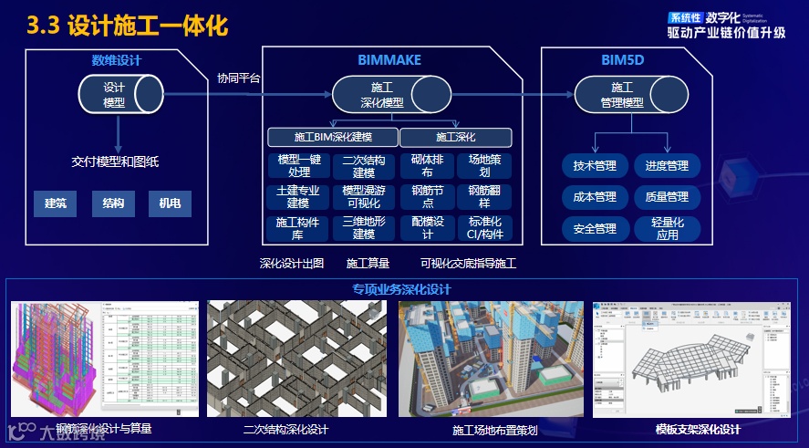 设计施工一体化,可以实现业务和数据的贯通。然而当下仍存在业务瓶颈和技术瓶颈。技术的突破相对简单,现在广联达设计、造价、算量、施工各个产品基于底层的PAAS平台,已经实现了数据的互通,可以实现将设计模型流转到施工阶段,在施工阶段更好的应用模型。但要突破业务瓶颈,路阻且长,设计和施工的数字化提升是关键。