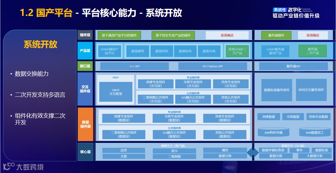 国产化的图形平台——广联达经过20+年的技术沉淀,形成了自主可控,技术领先的国产化三维图形平台,助推设计企业数字化转型新跃迁,提供了包含基础层、中间层、应用层的三层产品架构,其中基础层包括通用技术和核心技术,中间的平台层涵盖技术平台、数据平台及产品平台,支撑最上面应用层的产品及解决方案,全方面响应客户的需求。而作为核心技术中的完全自主可控的国产三维图形平台引擎,结合云、大、物、移、智五大技术,为勘察设计企业提供岗位级、企业级、行业级三层一体的整体解决方案,解决行业数字化发展的核心问题。