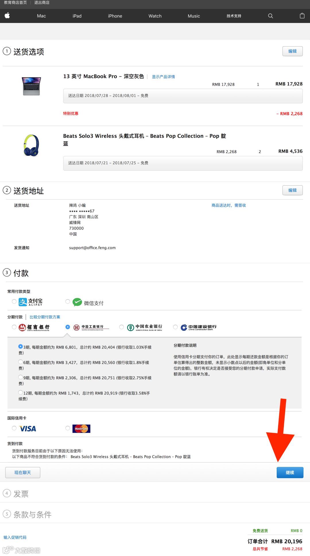 第六步:查看购物车、填写地址、选择付款方式(支持微信、支付宝付款,支持银行分期付款)