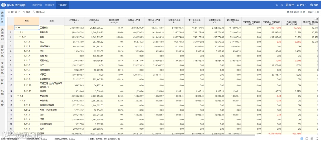 借助项管平台实现月度产值和目标成本对比,自动生成三算对比结果,通过精细化管控及时发现问题,扭亏为盈