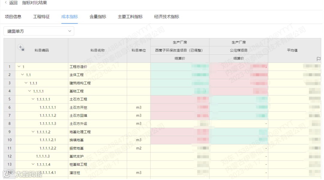 3、造价人员使用指标神器采用公式的科目标准分析指标;