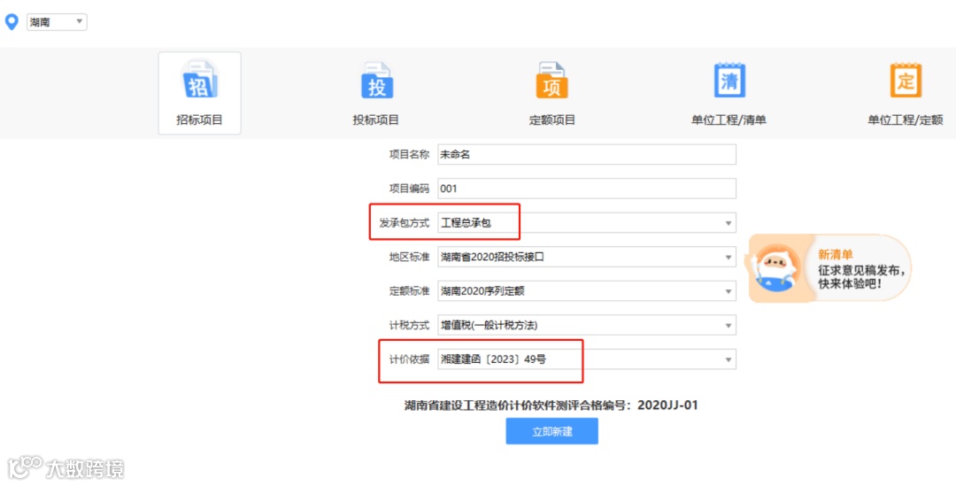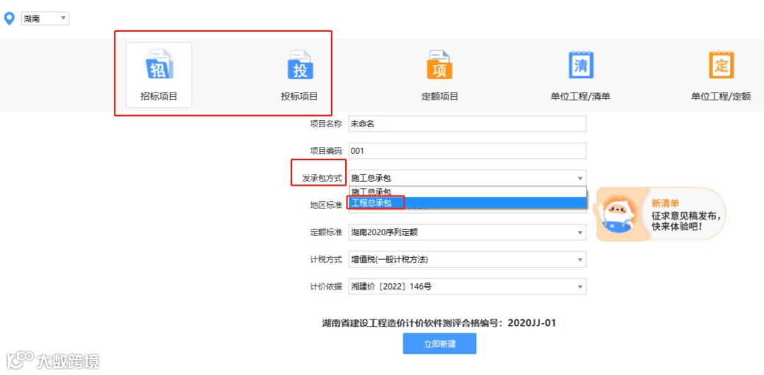 新建在招投标里对应承包方式选项模块,工程总承包模式同步对应计价依据湘建建函【2023】49号文。