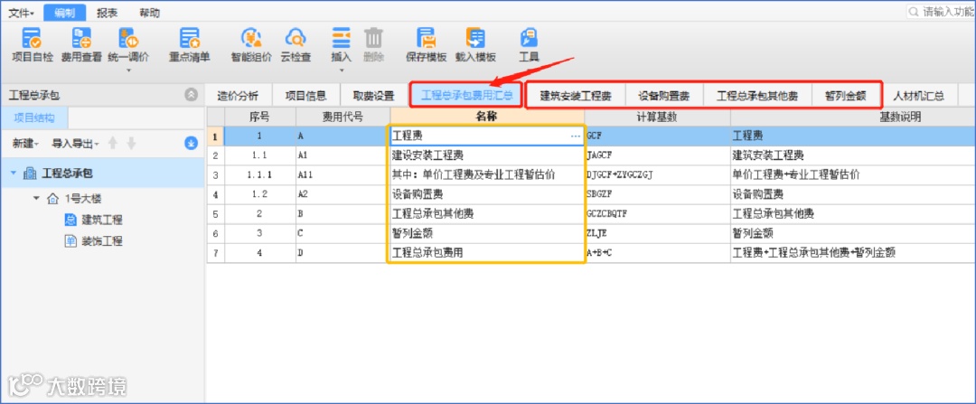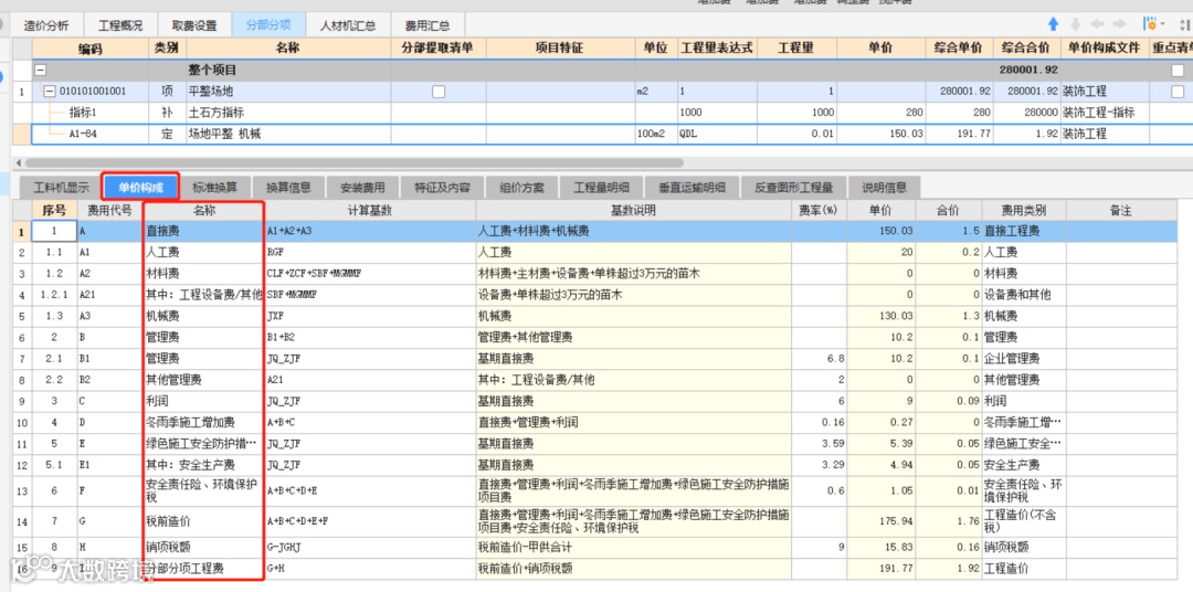 指标(拆分):已知人材机的单价作为基期取费价,进行取费计算,使用全费用综合单价