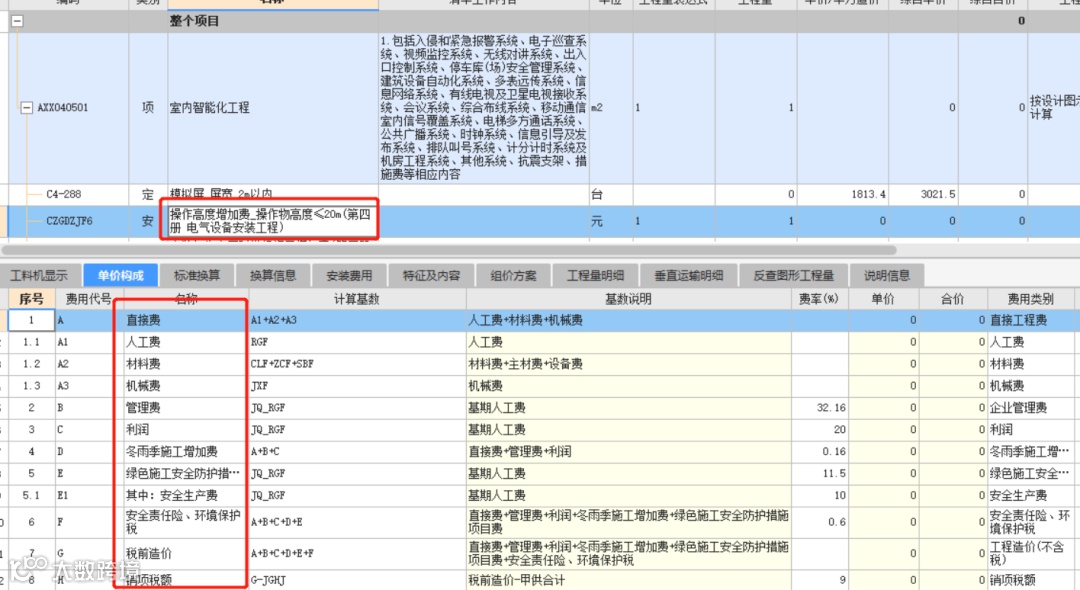 所有缺少费用构成明细的项目都会根据规定自动反算出绿色施工安全防护措施项目费和安全生产费。