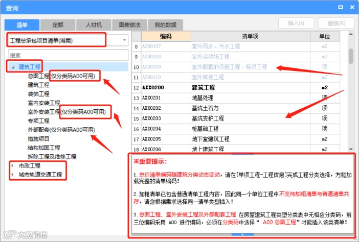 总图工程、室外安装工程及外部配套工程均采用A00进行编码,必须在分类码中选择A00总图工程才能插入该类清单。