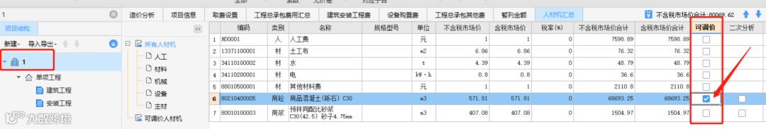 在现阶段EPC业务中,可调人材机需求较普遍,软件实现在项目层级-人材机汇总-勾选可调价。