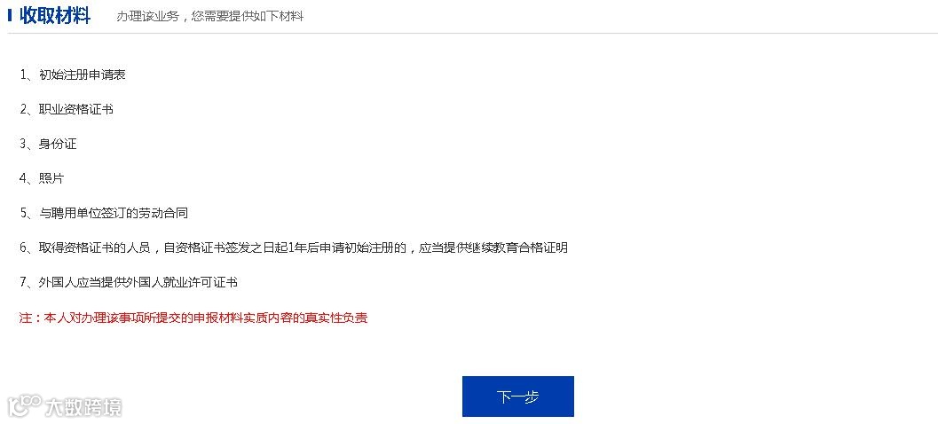 仔细阅读审批条件及收取材料所列事项,满足申请条件的才能进行业务办理,全选后,点击下一步,如下图: