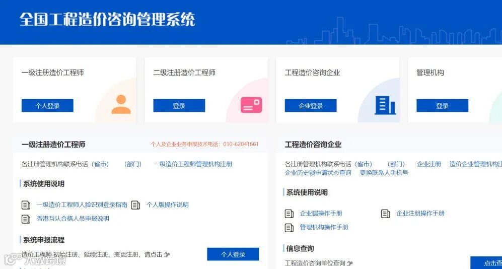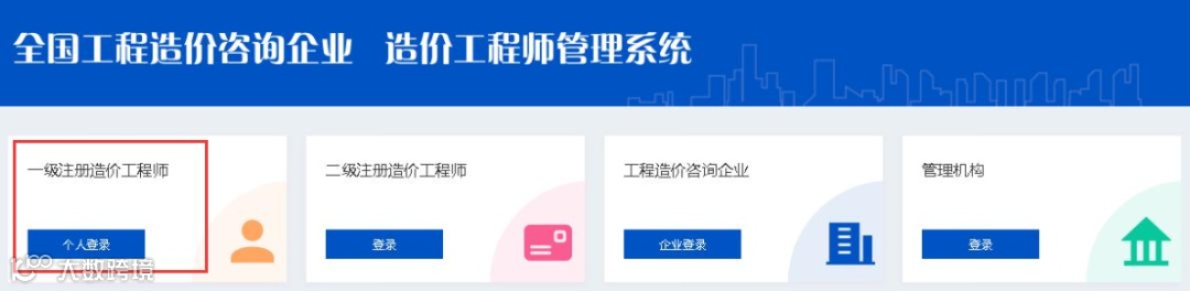 ①打开全国工程造价咨询管理系统,选择“一级造价工程师个人登录”,跳转至住房和城乡建设部政务服务平台,选择“个人用户登录”;