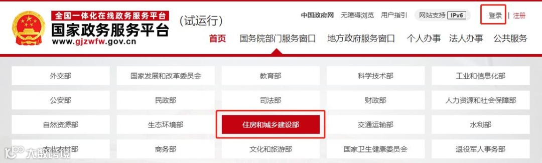 ⑥如从国家政务服务平台登录的,选择“住房和城乡建设部”,用国家政务服务平台账号登录: