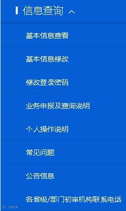 3、业务申报及查询说明、个人操作说明、常见问题、公告信息、各省/部门初审机构联系方式均为查看页面,可以查看相关信息。