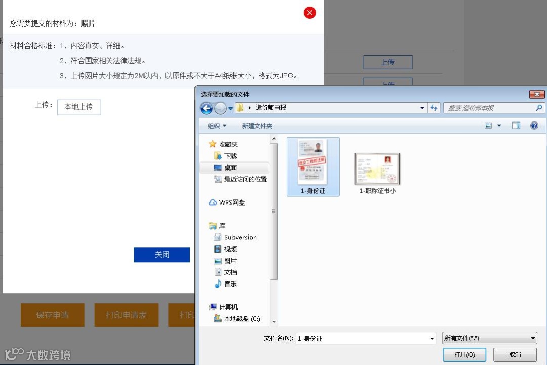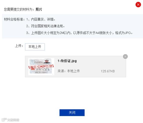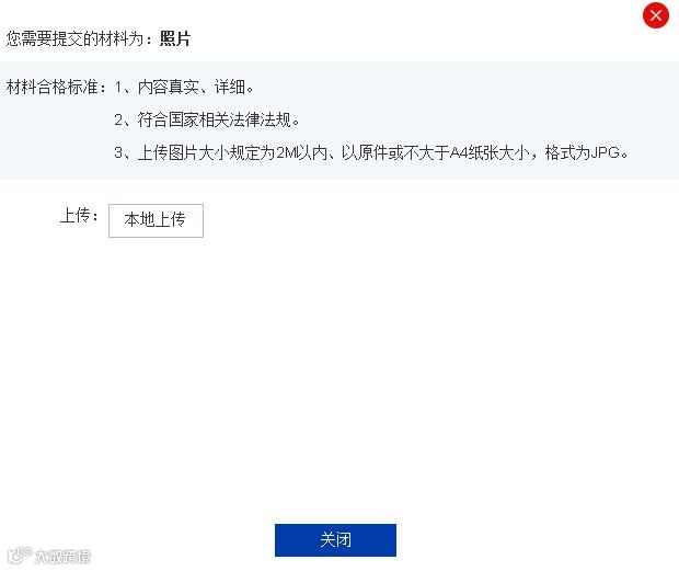 第一步:点击每个文件后的“上传图片”按钮,进入具体上传图片页面,按要求上传图片:【图片大小不能超过2M,图片格式可以为:*jpg、*.JPG】