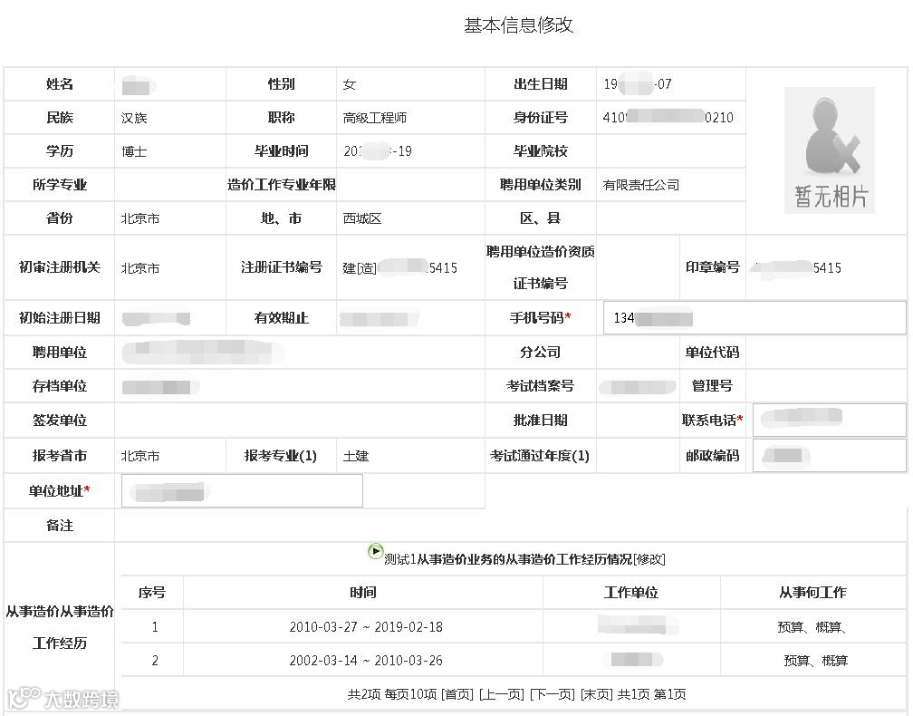 申请人需要修改聘用单位资质证书变更、身份证号码正常升位的,可使用该功能进行修改。(操作流程可参考“初始注册”)