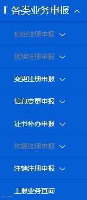 登录系统后,点击左侧菜单“各类业务申报”,展开操作列表如下图所示: