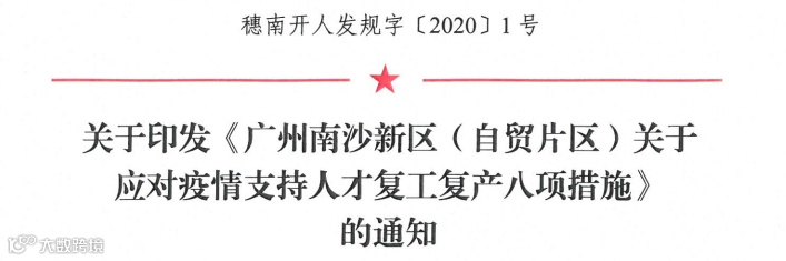 南沙区人才、科技、人社、住建四部门联合印发《广州南沙新区(自贸片区)关于应对疫情支持人才复工复产八项措施》。