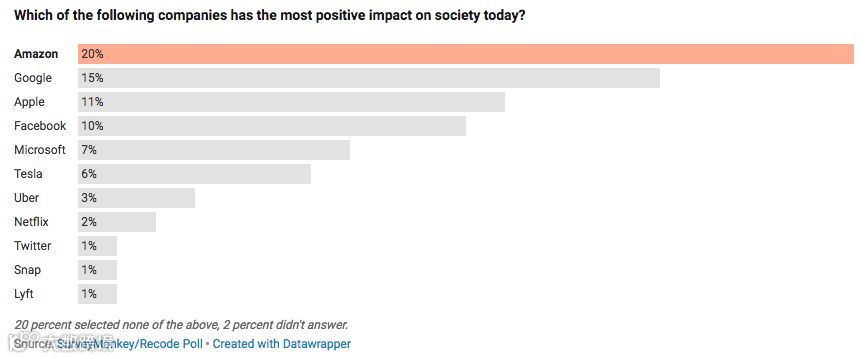 我们通常会从市值、规模、知名度等方面来对各大科技企业排名,在这些榜单里,第一十有八九都是苹果了。那么如果以“社会正面影响力”来衡量,哪家科技企业能够夺魁呢?今天科技博客 ReCode 就在美国进行了这项调查,结果显示,亚马逊成为美国民众心中最正面的科技企业,而苹果仅排第三。