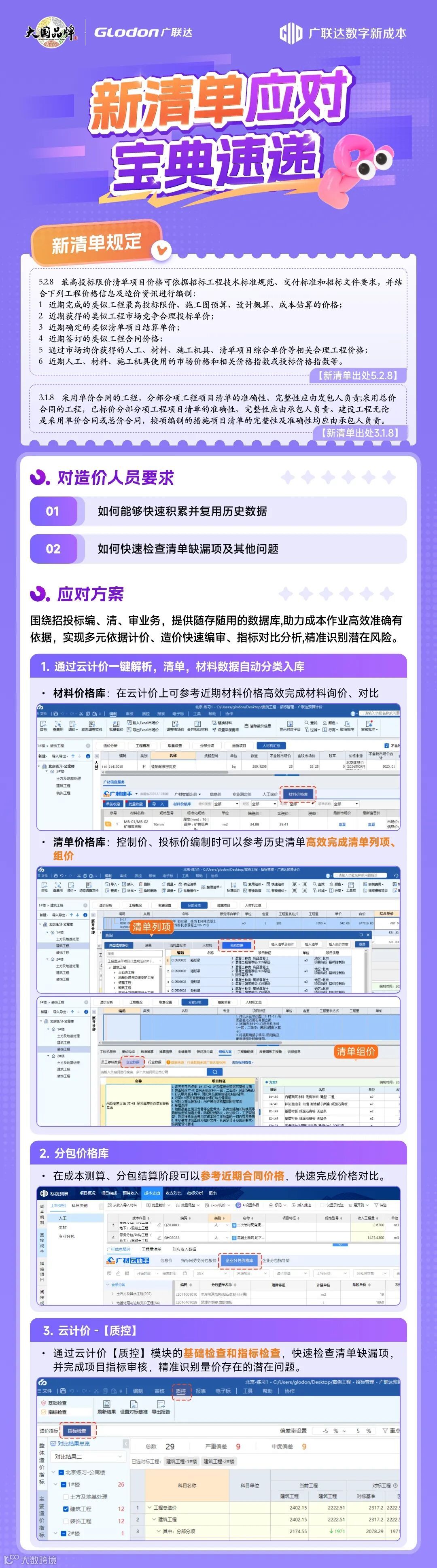 工程造价领域迎来新清单规范,对造价人员的工作提出了更高要求。作为造价人,你是否还在为历史数据复用难、清单缺漏项检查耗时长而头疼?别担心,广联达数字新成本为你带来新清单应对宝典,助力你在新清单时代高效精准开展造价工作!
