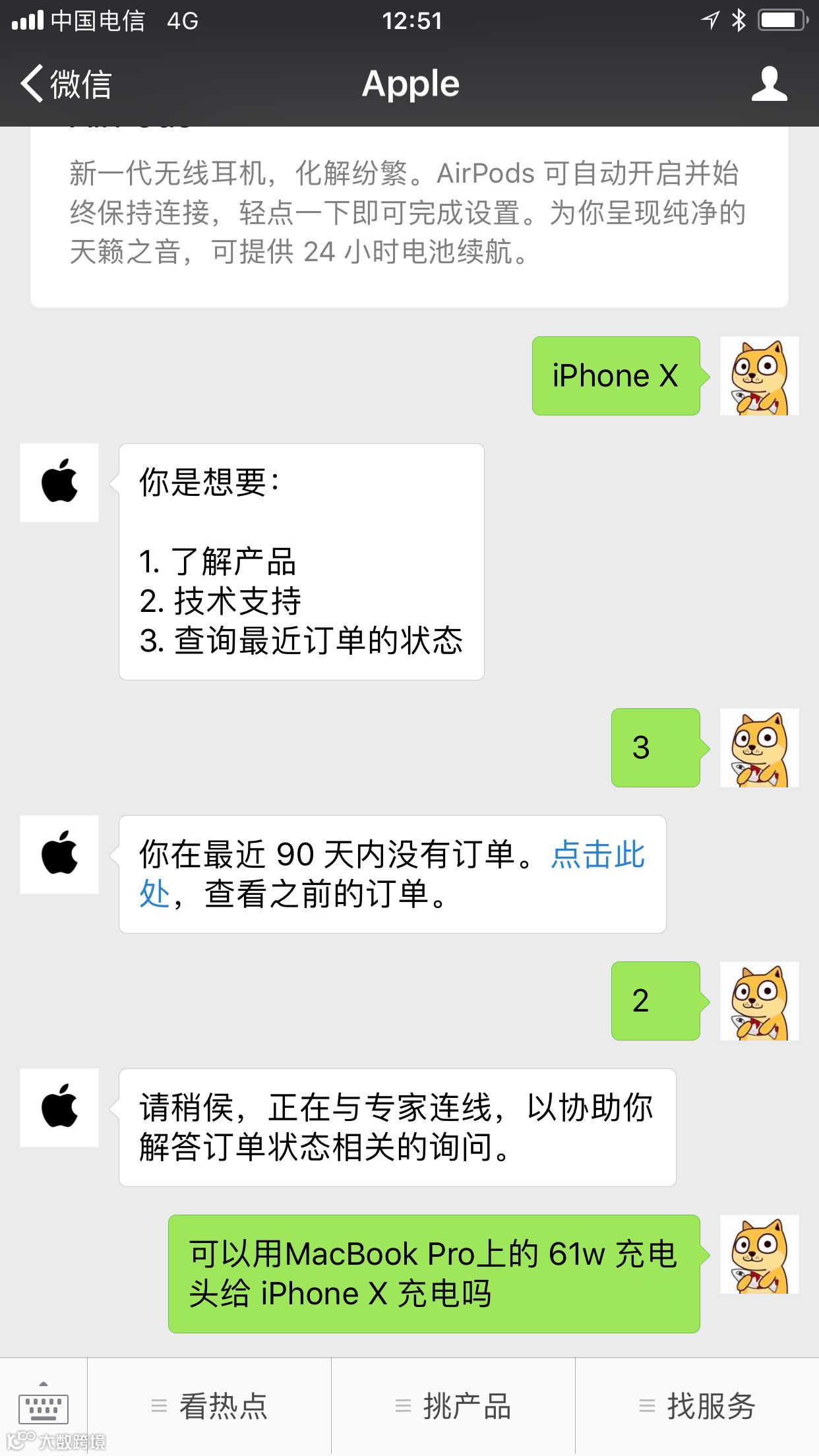 苹果终于开通了微信公众号(ID:Apple),根据辣鸡小编亲测可以在线购买、答疑、预约维修时间、查看维修记录。可以说打通了非常多的接口,以后很多之前需要在 「Apple Store 」或者 「Apple 支持」里面才能实现的功能以后只需要在微信上操作就行了,推荐广大果粉关注。