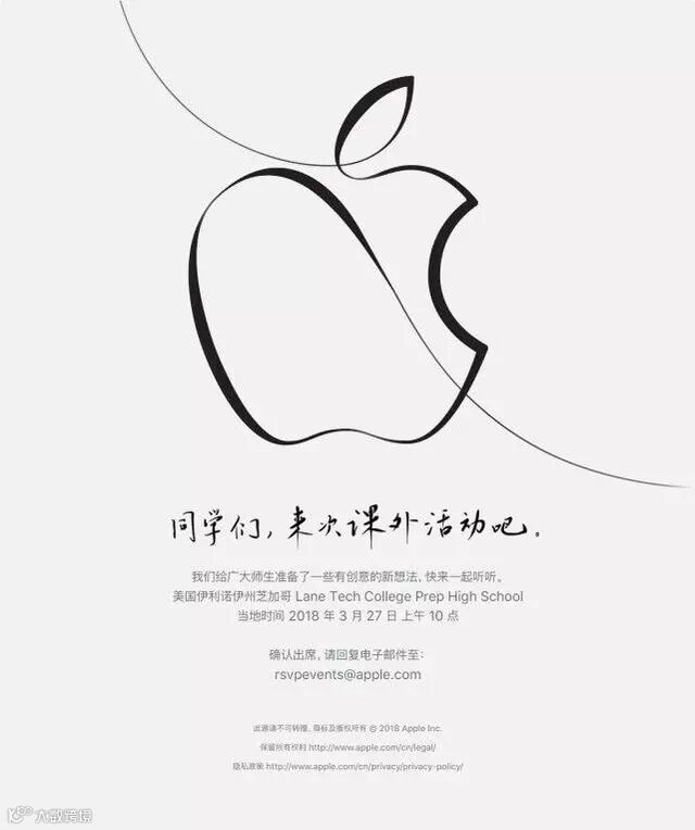 “我们给广大师生准备了一些有创意的新想法,快来一起听听。”——由此可见,这场发布会主要是针对学校师生的,与教育息息相关,而提到苹果的教育理念和产品,大家首先都会想到 iPad,根据之前的消息预测,苹果可能会在春季发布入门级的 iPad 产品,价格更为便宜,还有一款入门级的 13 寸 MacBook 也在预测之中。