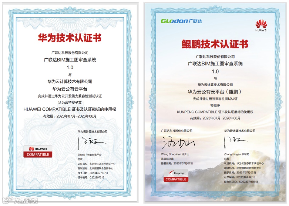 近日,由广联达科技股份有限公司(以下简称广联达)自主研发的BIM施工图智能审查系统通过了华为云“沃土云创计划”方案认证,并被授予“HUAWEI ENABLED” 和“HUAWEI COMPATIBLE”等证书及相关认证徽标的使用权,标志着广联达在云化升级和国产化信创适配方面更进一步。