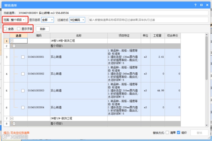 2、手动替换完之后一起选中清单子目点击替换数据功能键,弹出替换清单的弹窗,弹窗默认会先以编码前九位进行过滤清单方便选择需要替换的内容。弹窗左上角可选择范围,全选当前过滤出的清单或显示子目详情单独勾选需要进行替换的清单项;