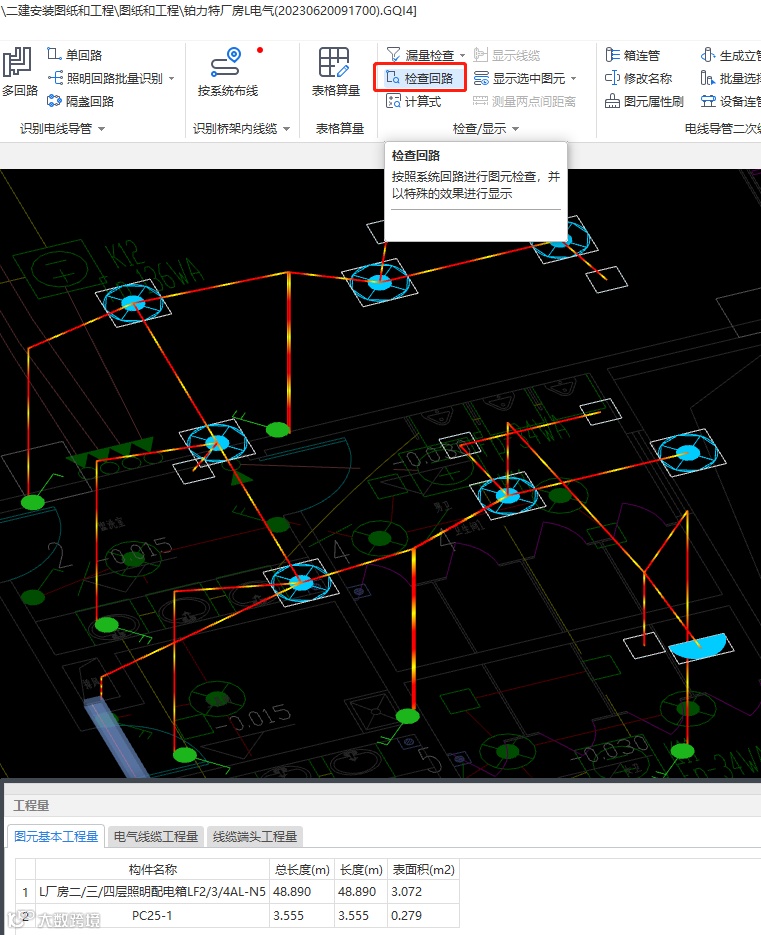 b.当用户进行分系统回路检查图元或者分系统回路进行核对工程量时,可以使用此功能(桥架,配管、线缆等也均支持此功能的操作)。