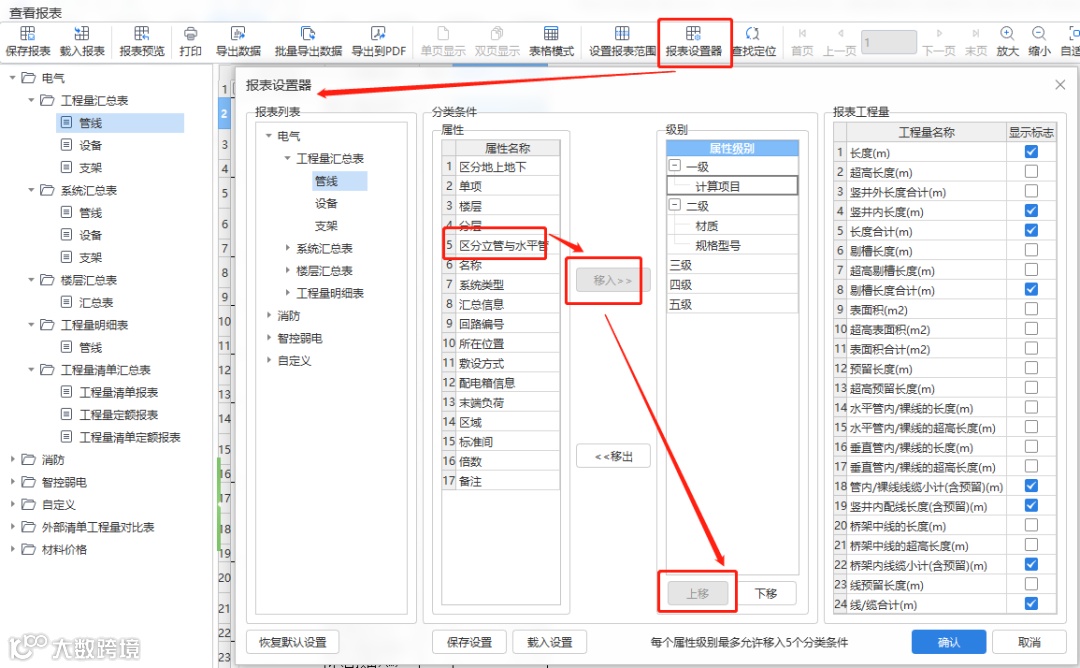 a.报表预览、分类工程量、套做法,均支持电气专业区分水平管、立管出量;