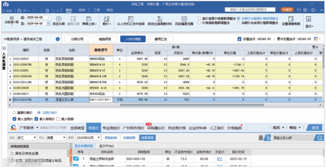 软件内置四种调差方法,根据合同约定选择可调差人材机,设置风险幅度范围、调差方法、确定当前期价格后,自动计算价差结果,实现材料高效调差。