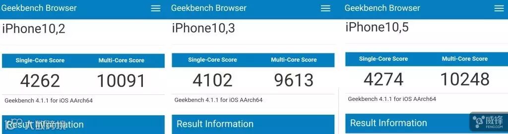 对于六个 CPU 核心全部发挥性能这一点,究竟提升多大还不清楚,但至少在基准测试上,目前泄露的跑分成绩相当惊人。从下面图可以看到(10.2、10.3 和 10.5 分别对应三款新机型),A11 仿生在 Geekbench 4 的性能基准测试中,单核平均得分高达 4169,而多核得分也有 9837 将近一万的分数,秒杀所有手机行业内同基于 ARM 授权设计的移动处理器。