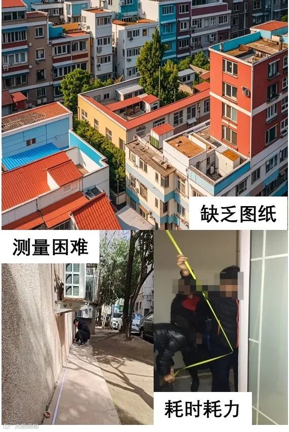 人工误差大,成本高,难以满足大规模旧改需求。尺寸巨大,多人测量,很多位置完全无法测量。