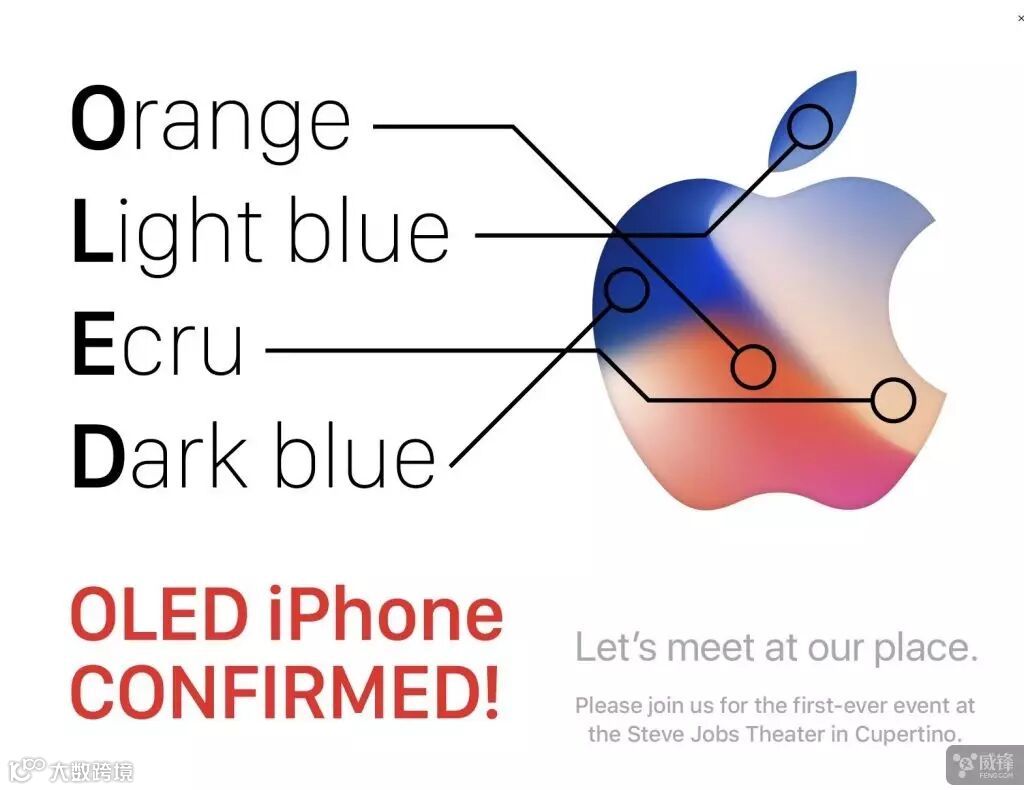 2、OLED 屏幕。网友们怎么看出来的呢?将邀请函上苹果 LOGO 的颜色全部提取出来,然后再将它们的首字母拼到一起,没错!就是 OLED ,这得多有想象力才能看得出来啊……