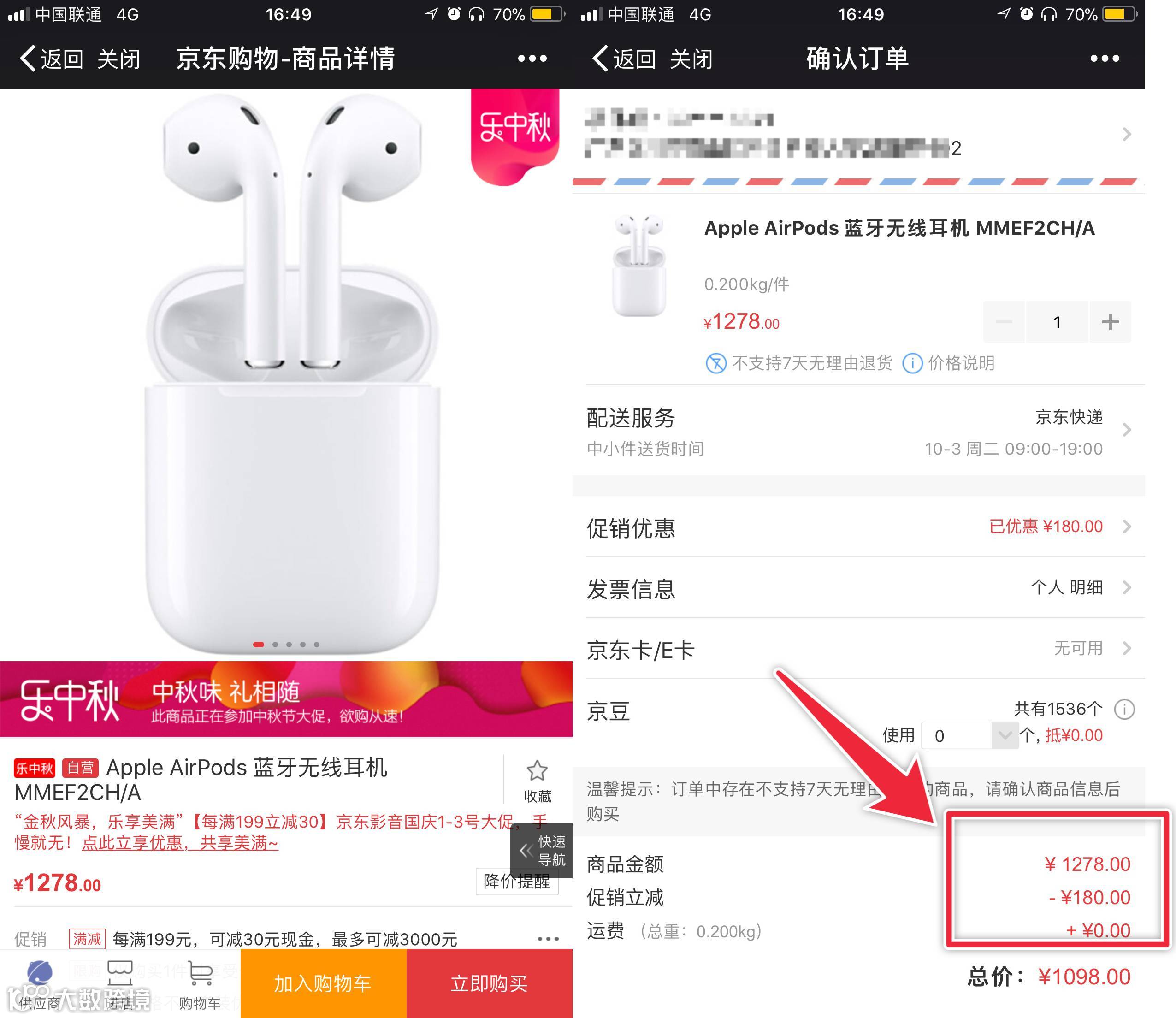 经锋友在微博提醒,目前京东正在举办“金秋风暴,乐享美满”的影音类促销活动,其中之前一直产能不足的 AirPods 下单后直降 180 元,相当于 1098 可以拿到 AirPods,加上京东的物流和售后,如果你之前一直错过 AirPods 的促销活动,那么这次可谓非常好的时机。