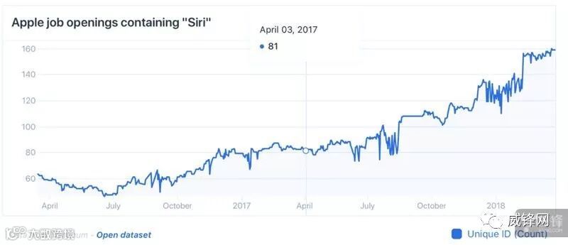 thinknum是一家专注于观察招聘信息的网站,他们近日发文称,在苹果最新的招聘人员列表中,含有“Siri"的职位多达161个,这个数字比上个月上涨了24%,创下了历史新高,并且这也是这类职位连续第九个月上涨了,如下图所示: