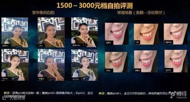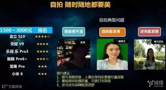 而在 1500 - 3000 机型中,拍照从好到差的排名是金立 S10、荣耀 V9、乐 Pro 3、魅族 Pro 6+、坚果 Pro 和小米 6。中国移动表示,这些机型自拍存在较为明显的典型问题,例如夜拍看不清,脸部发黄或者逆光脸部发黑等,并建议这些机子能提升美颜效果,但同时尽可能保留人像自身特征,重视夜拍质量,完善打光效果,而逆光应优先保障脸部清晰。
