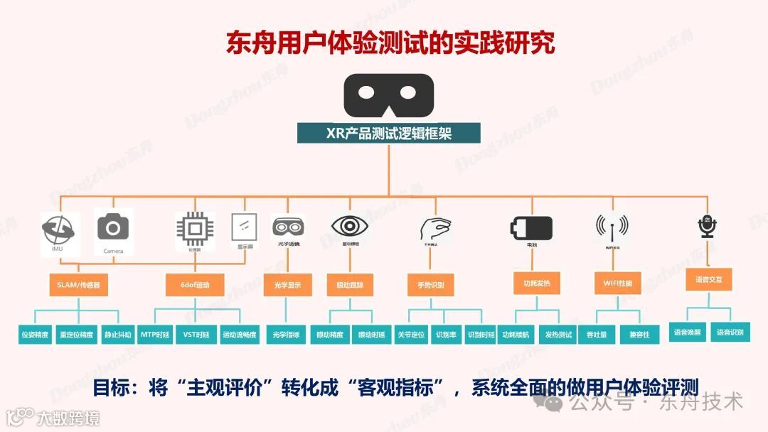 作为一家专业的智能测试产品与服务提供商,东舟在用户体验测试方面拥有多年的理论积淀和实践经验。用户体验测试需要从多个维度进行考量,包括视觉、听觉、触觉等等,同时还需要考虑用户在使用过程中的心理感受、认知负荷等因素。在这些方面,东舟建立了一套完整的XR产品用户体验测试体系,包括多种测试方法和工具,涵盖了从产品设计到开发、从测试到优化的全过程。