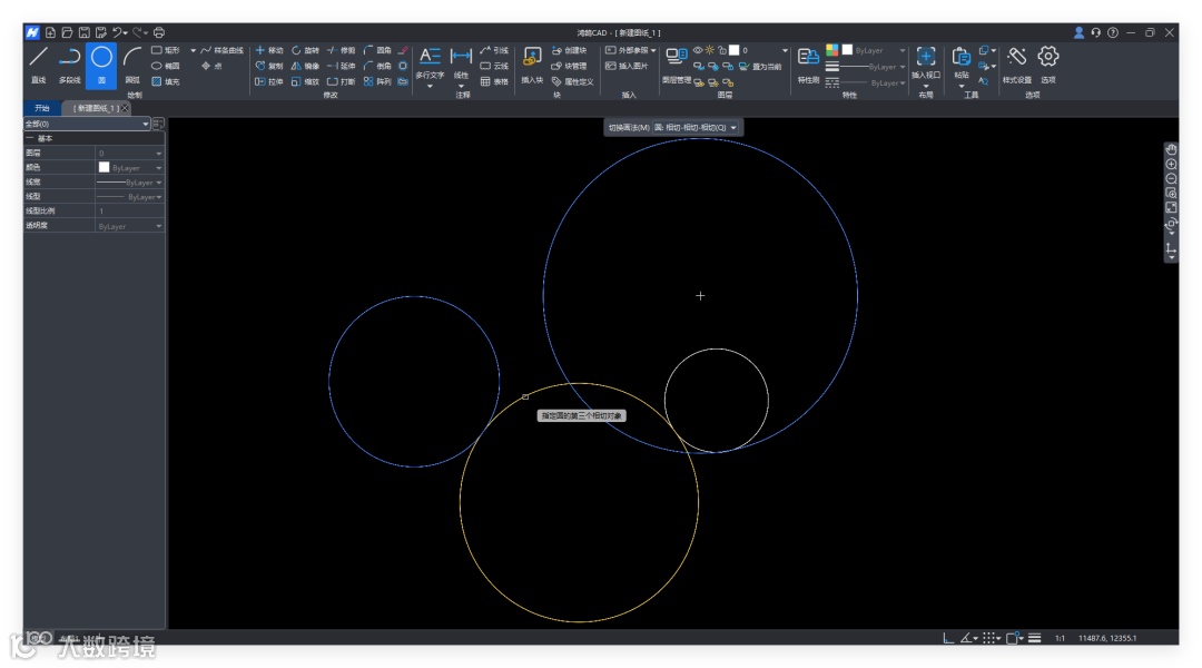 ”,然后分别选中3个圆,软件就会在选中第三个圆的第一