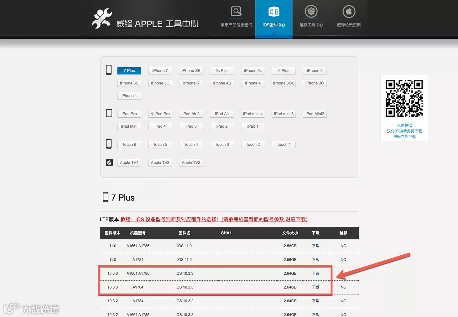 1、下载固件:点击威锋网首页 feng.com 进入固件下载中心,然后根据自己的型号下载 iOS10.3.3 的固件(务必按照型号下载)