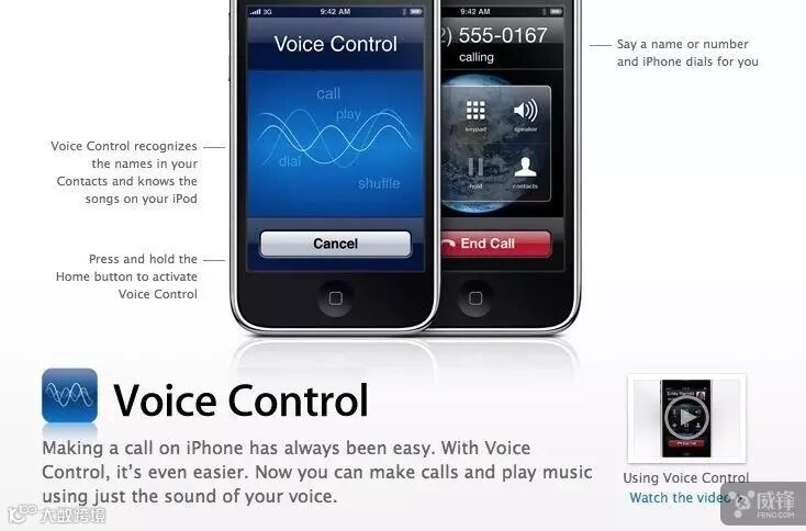 iPhone 3GS 中整合了更为强大的 CPU,iPhone OS 3 得以充分利用 CPU 带来的强大性能,其中最重要的就是增加了 Voice Control,它算是 Siri 的老祖先。那么如何激活这个功能呢?长按 Home 键或者是苹果 Earbuds 耳机的中键。由此苹果也调整了强制退出应用的手势,变成先按下电源键然后再长按 Home 键即可强制退出一款应用。