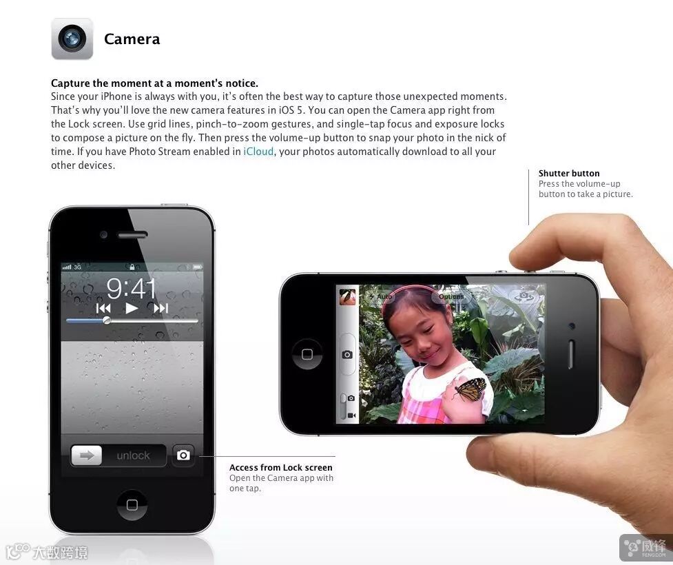 iOS 5、Siri 和 iPhone 4S 同步上线,苹果将原本用于激活Voice Control的手势用到了 Siri 的身上。iOS 5 还增加了一个解决方案,主屏幕双击即可调出相机应用以便用户快速拍照。不过这个解决方案实在是“短命”,苹果在 iOS 5.1 中就取消了这个操作,以一个轻扫手势来替代。现在从锁屏快速调出相机拍照已经成为一个很受欢迎的功能。