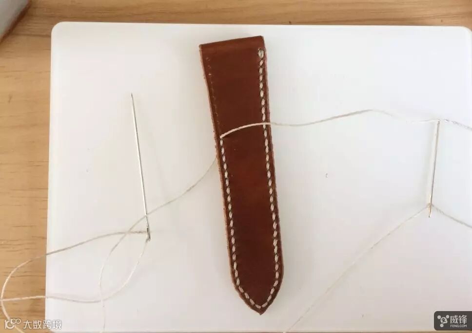接下来就是上胶,固定外皮和内皮。粘好之后,再切成大概的形状。随后就是打孔缝线、封边打蜡。为了让表带看起来更棒,我们可以擦点貂油保养,让表带看起来更加的亮眼。