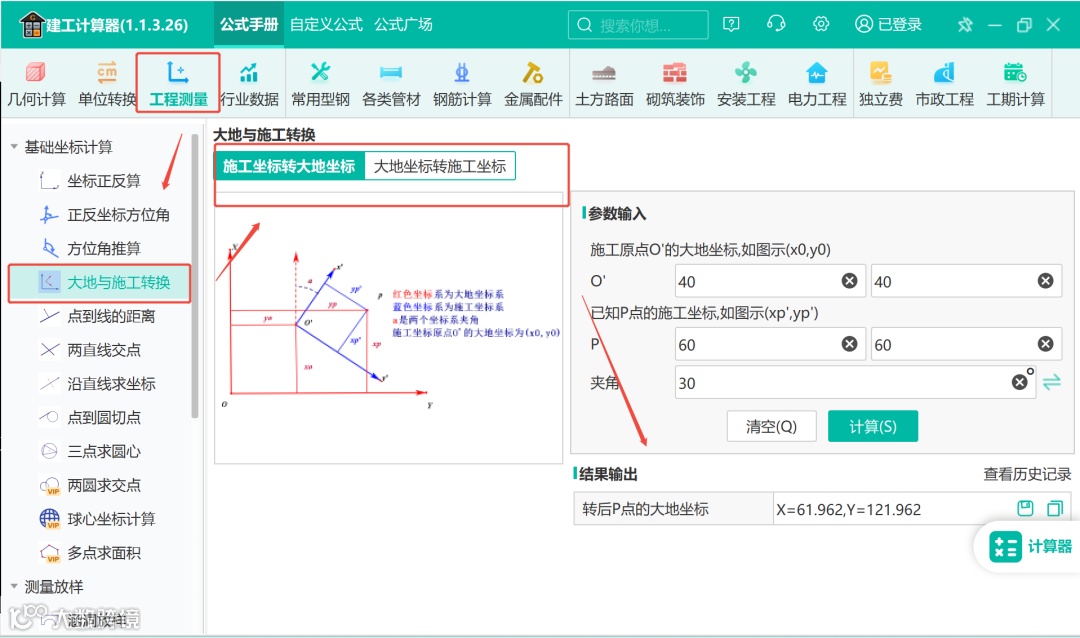 本文针对施工现场坐标转换的复杂计算难题,提出了高效解决方案:通过建工计算器【大地和施工转换】功能输入已知参数即可实现坐标一键转换。该方法可与CAD快速看图的【坐标】测量配合使用,在获取准确坐标值的基础上快速完成坐标系统转换,大幅提升了测量放样的工作效率和准确性。