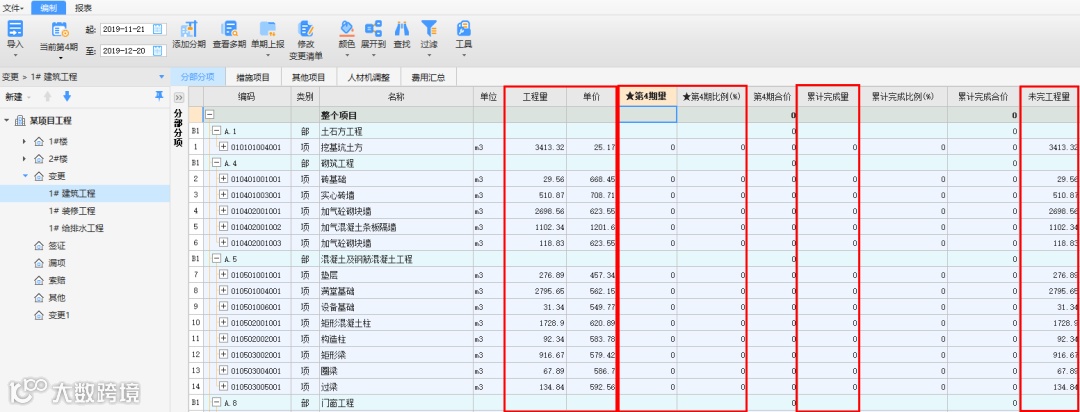 可以按照进度报量时间快速添加每一次分期进行报量数据填写