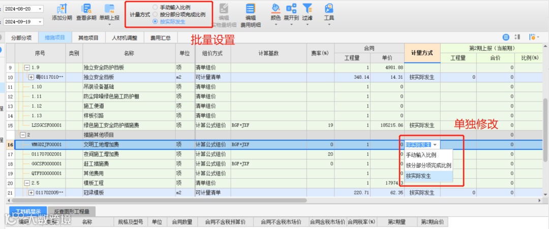 措施项目支持三种数据输入方式:按实际发生、按分部分项完成比例、手动输入比例供大家进行选择
