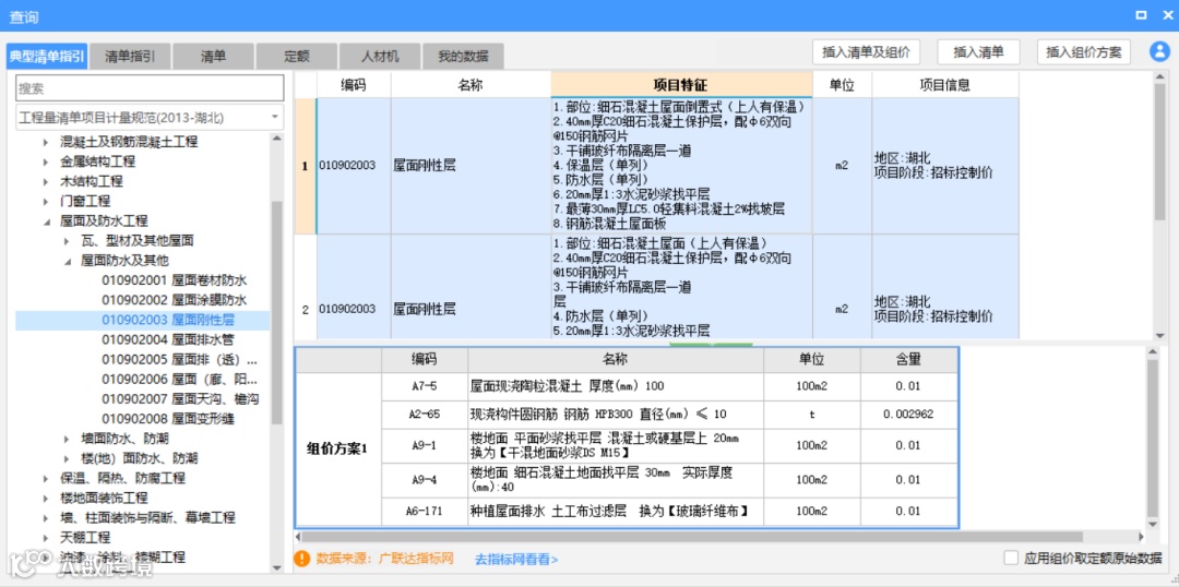 利用指标网内置的“典型清单指引” 功能,李工可快速调用符合湖北最新定额的标准化清单,仅需根据图纸微调差异细节即可完成组价。