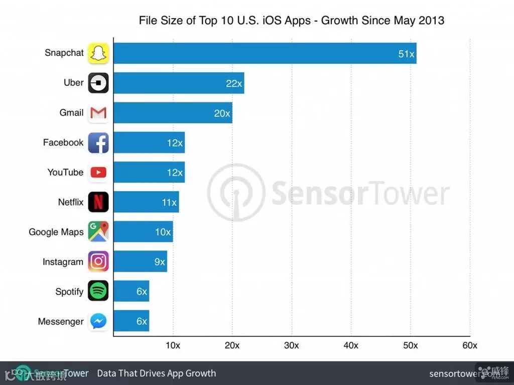 Sensor Tower 经过研究之后发现,这一趋势存在于美国排名前 10 的 iOS 应用中,专家研究公司也因此将这个趋势与苹果于 2015 年做出的将应用程序的大小上限提升至 4GB 的决定联系在了一起。