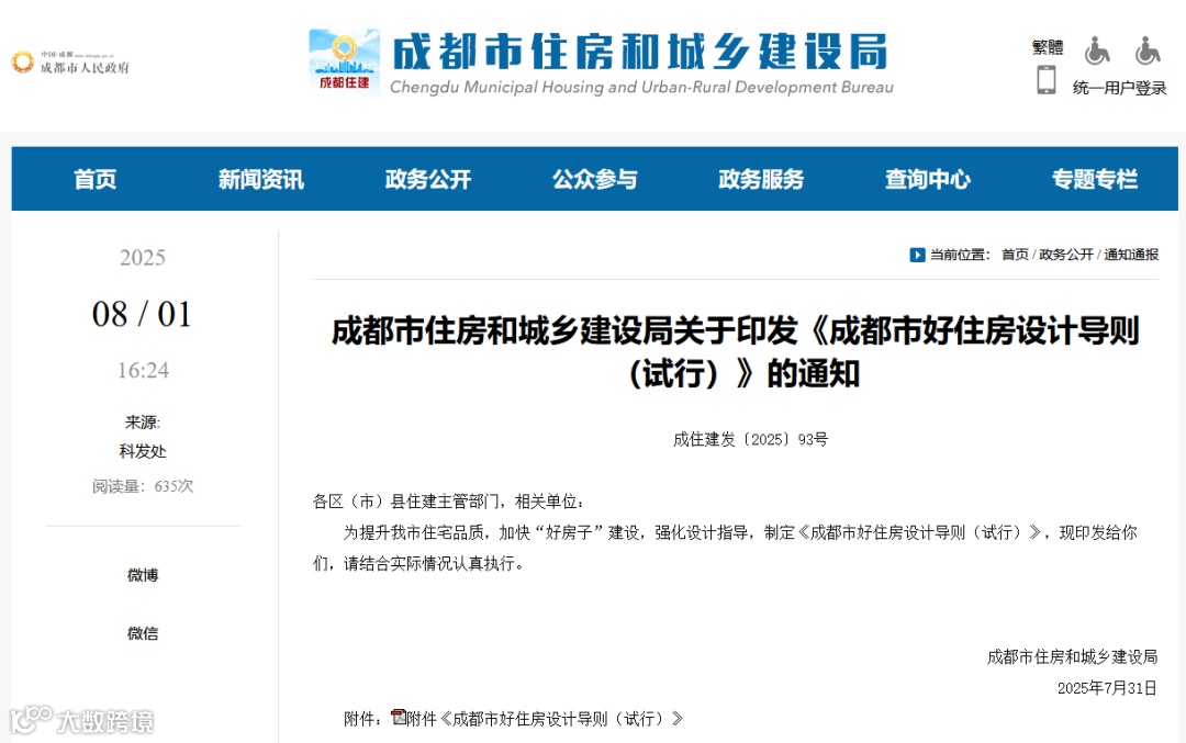 《导则》共 5 章 117 条,立足“安全、舒适、绿色、智慧”建设要求,在住房设计上细化完善,为成都好住房的建设提供了清晰指引和有力支撑。